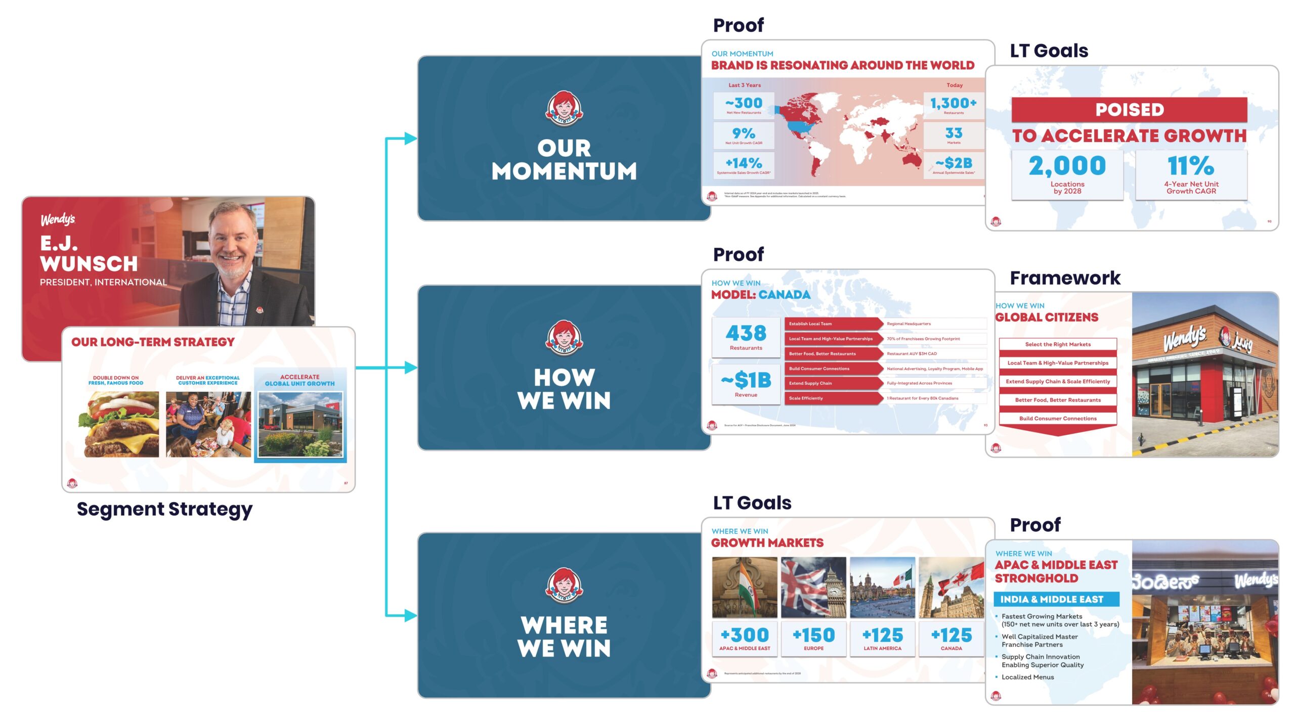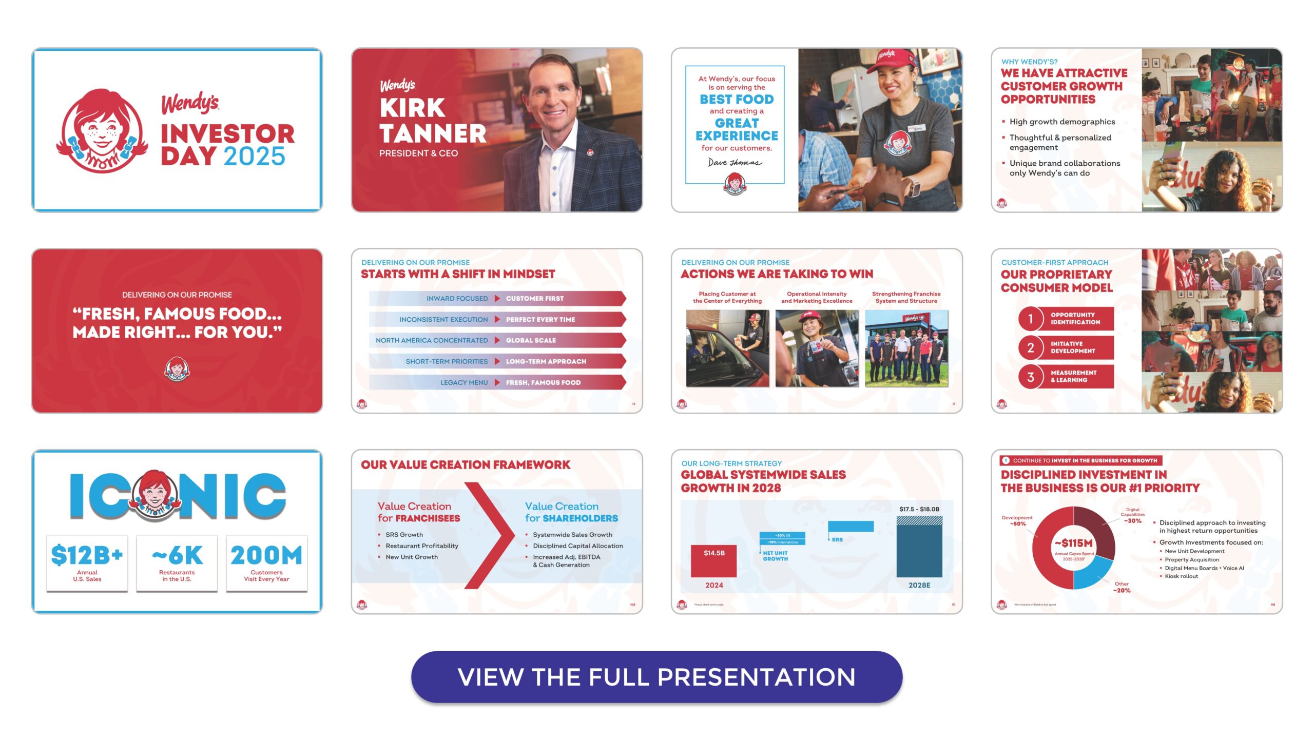 For its International segment, Wendy’s took a textbook approach to strategic storytelling. First, they painted the opportunity across key geographies (e.g., Canada, LATAM, Europe, APAC). Then they outlined a repeatable playbook: scale the supply chain, build strong local teams, and tailor the menu. Throughout, they showed real progress, including 14 percent systemwide sales growth and over 3 million dollars in AUVs in Canada. They showed how the playbook and frameworks were used in action.