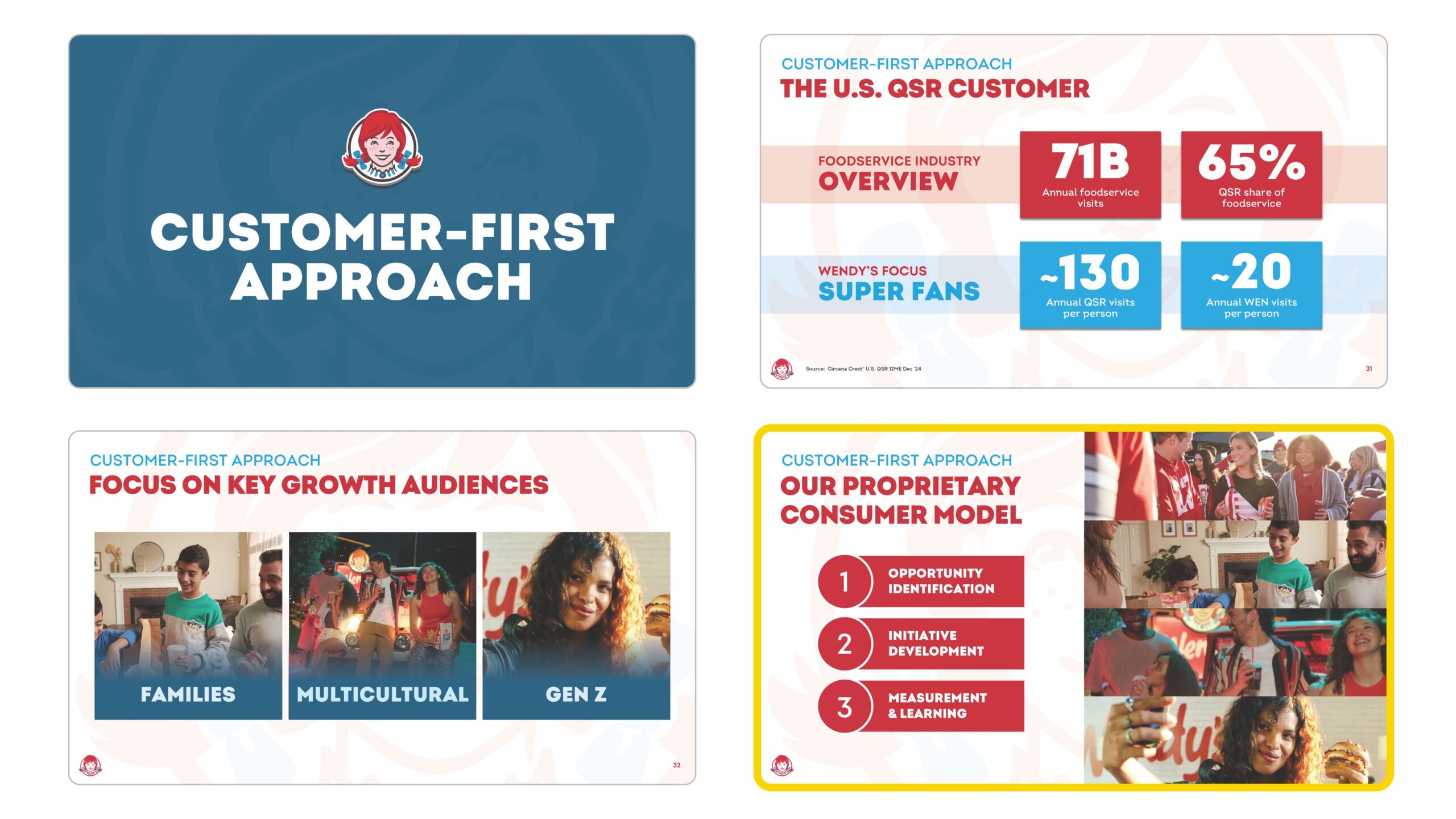 One example was the Consumer Model introduced by the CMO. She began with the size of the prize by identifying Wendy’s most loyal customers. Then she focused on three key growth segments: families, the multicultural demographic, and Gen Z. To focus on each persona, the team applied a proprietary three-step approach: