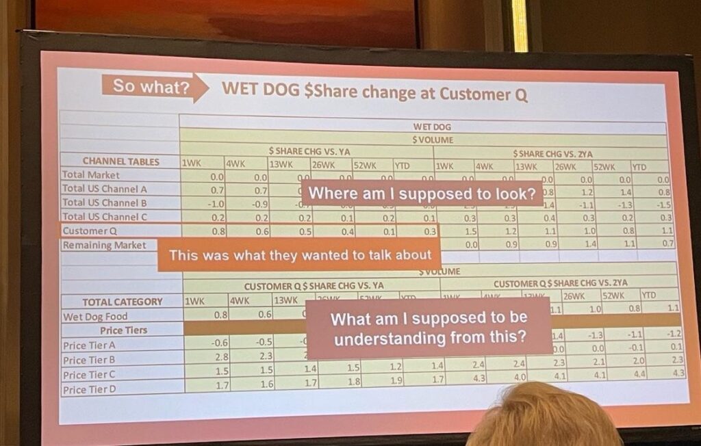 Benjamin James (Shopper Insights @ Nestle Purina) delivered a funny session on how (in his previous life obviously) he engaged in “death by PowerPoint” by inundating his audiences with too much data and too less insights.