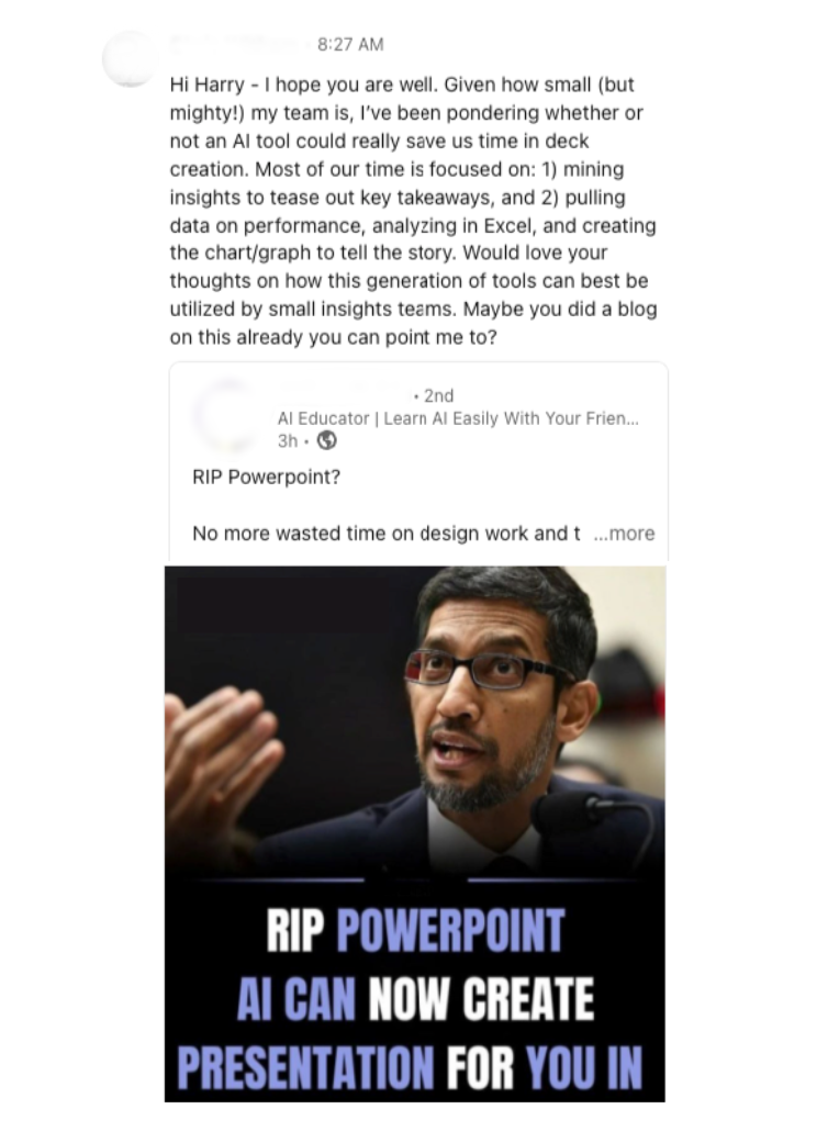 Start Small, Then Expand: If you haven’t yet, get a paid AI subscription. Test it for writing emails, summarizing research, or generating slide ideas. Share what works with your team—you’ll be surprised how quickly it sparks I Inspiration.